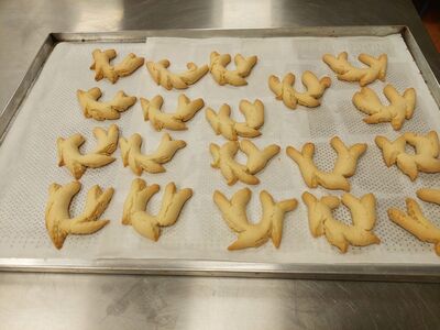 Od tijesta oblikovati rukama štapiće na dužinu cca 15 cm, zarezati malim nožem na krajevima i na još 2-3 mjesta. Savinuti u oblik potkove i staviti u pleh za pečenje na kojem je papir za pečenje. Peći 10 min na 180°C, dok lagano ne porumene.