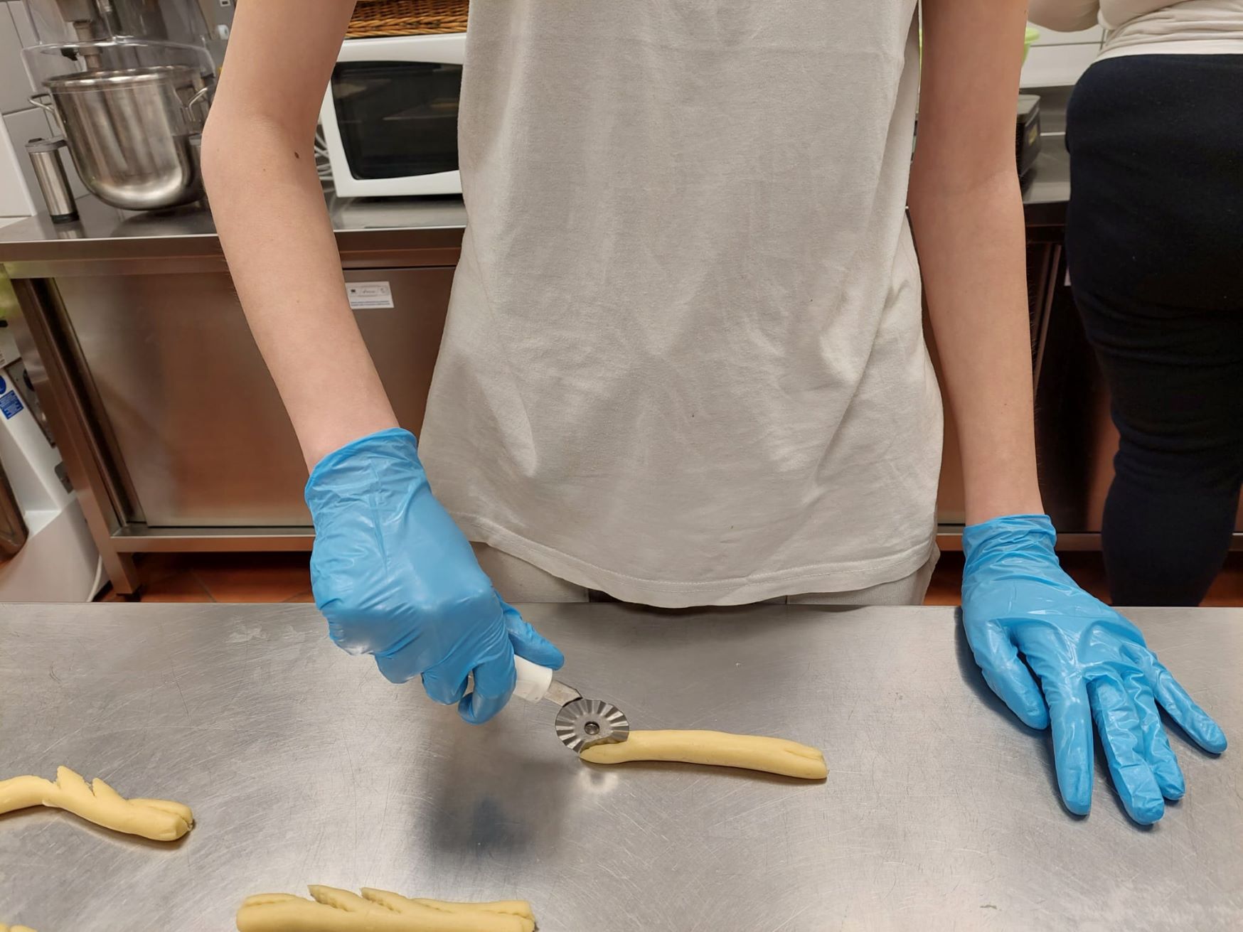 Od tijesta oblikovati rukama štapiće na dužinu cca 15 cm, zarezati malim nožem na krajevima i na još 2-3 mjesta. Savinuti u oblik potkove i staviti u pleh za pečenje na kojem je papir za pečenje. Peći 10 min na 180°C, dok lagano ne porumene.