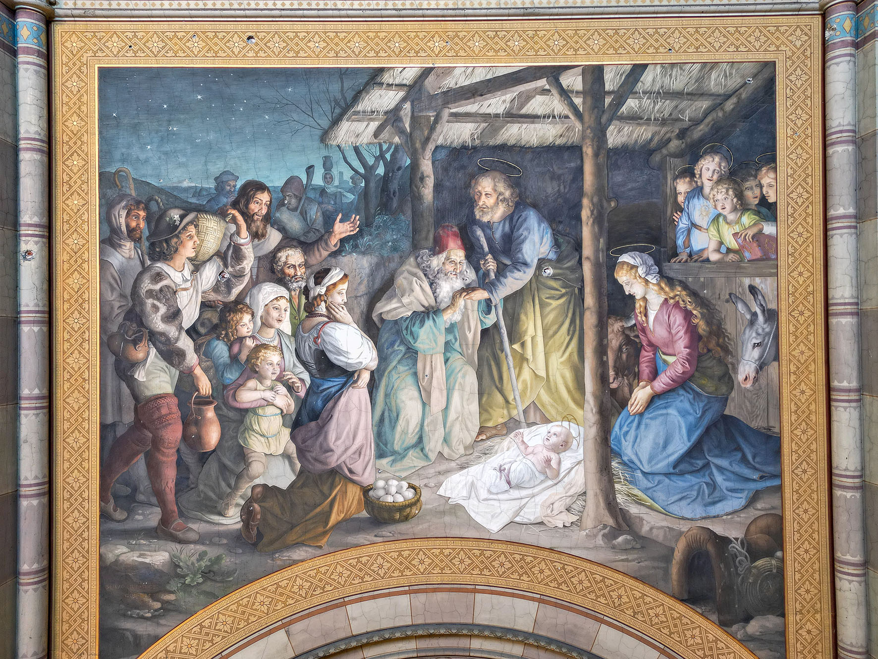 O povijesnom, umjetničkom i simboličkom kontekstu fresaka govorio je Mirko Ćurić, ravnatelj Srednje strukovne škole Antuna Horvata u Đakovu, oslanjajući se na bogatu stručnu literaturu i misli samoga biskupa Josipa Jurja Strossmayera. U svom je izlaganju približio nastanak i značenje božićnih prizora u sklopu monumentalnog fresko-ciklusa đakovačke katedrale, osobito se zadržavši na slavnoj Seitzovoj fresci Rođenje Isusovo iz 1874. godine, koju je Milko Cepelić proglasio „najljepšom slikom Božića na svijetu“. Ćurić je istaknuo kako ta slika, kroz igru tame i svjetla, izražava samu srž kršćanske poruke: Kristovo rođenje kao svjetlo koje raspršuje tamu svijeta.