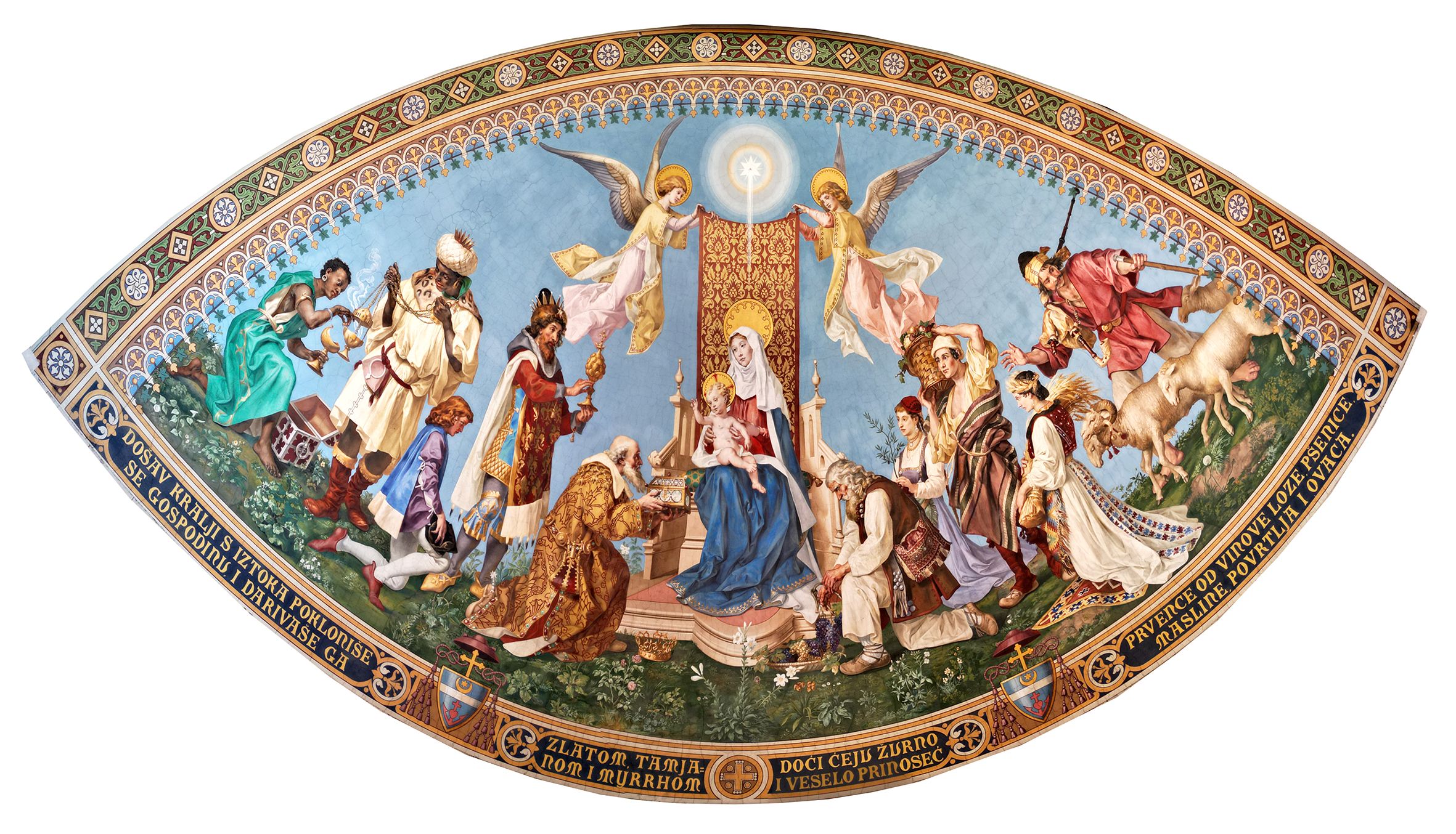 U nastavku se osvrnuo i na fresku Poklonstvo triju kraljeva. Govoreći o toj fresci, istaknuo je njezinu teološku i kulturnu slojevitost: prizor Bogojavljenja u kojem se Krist objavljuje svim narodima, ali i snažnu poruku koju je biskup Josip Juraj Strossmayer svjesno ugradio u kompoziciju. Uz mudrace s Istoka, na fresci se pojavljuju i likovi koji simboliziraju „naš narod“, čime se univerzalna kršćanska poruka povezuje s konkretnim povijesnim i narodnim iskustvom. Tako freska Poklonstva ne prikazuje samo biblijski događaj, nego postaje vizualni izraz Strossmayerove vizije naroda koji svoju nadu, snagu i budućnost pronalazi u susretu s Kristom, uz poznatu Strossmayerovu posvetu Slavi Božjoj, jedinstvu crkava, slogi i ljubavi naroda svoga!
