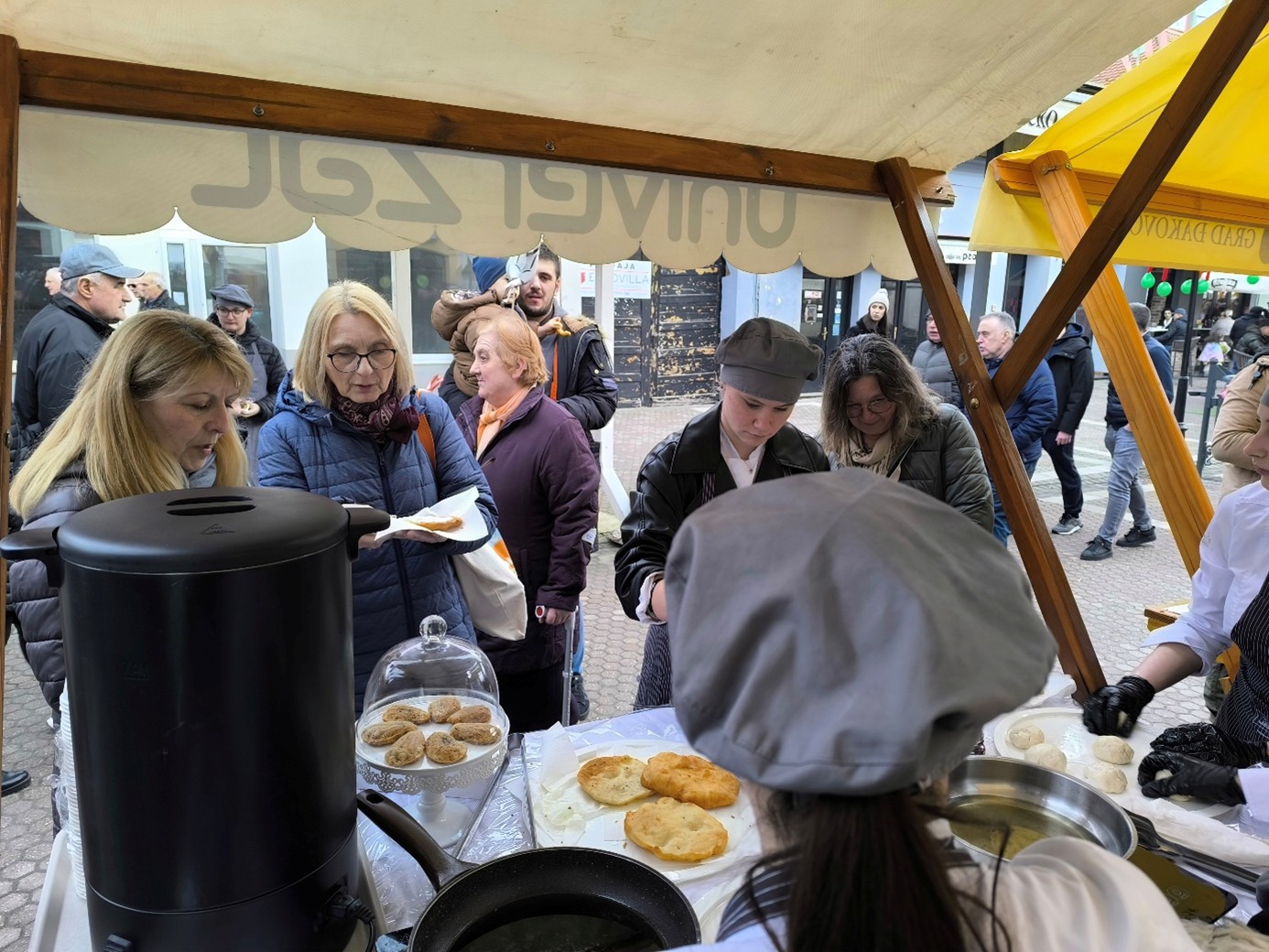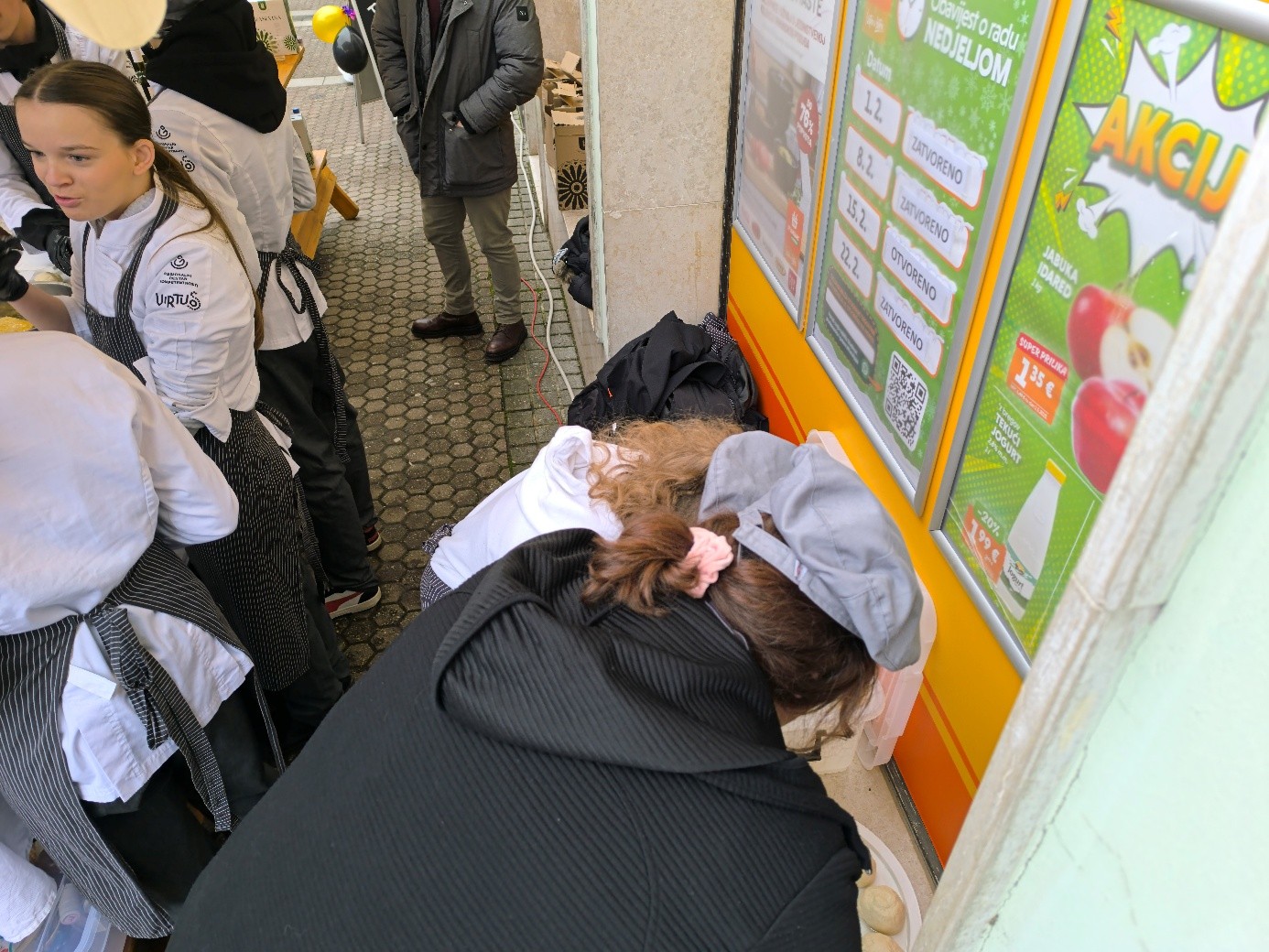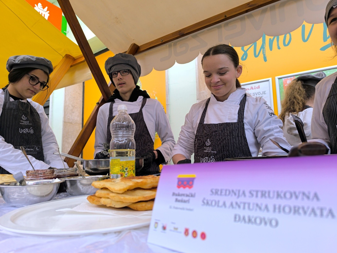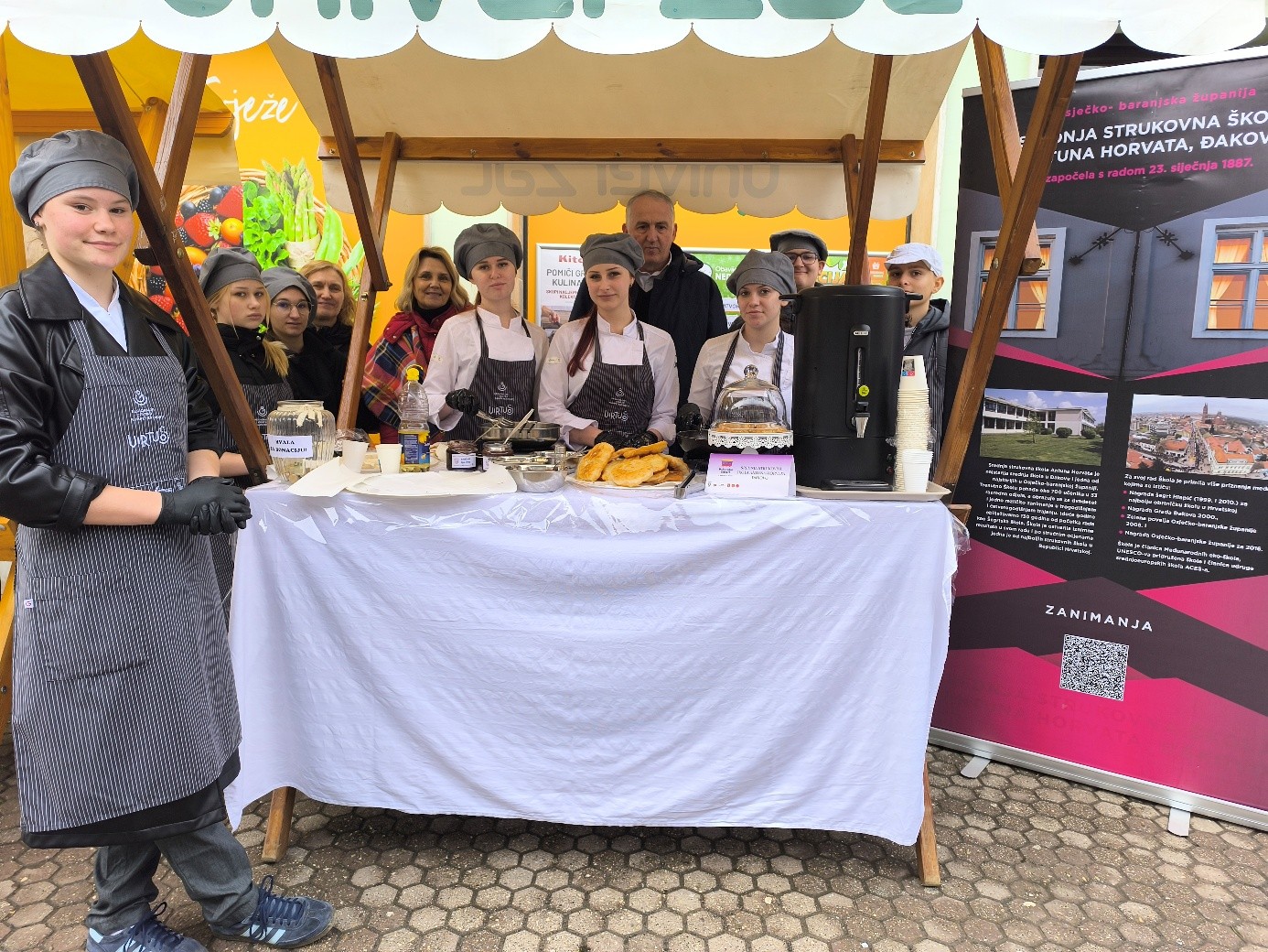 Naša škola sudjelovala je u ovom programu s proizvodom prigodnim za ovakvo događanje – langošicama. Učenici prvog razreda kuhari i pekar -slastičari i učenice drugog razreda slastičarke, zajedno sa svojim nastavnicama Nevenkom Kokalović i Marijom Katilović, predstavili su školu zanimljivom radionicom izrade tradicijskih pokladnih proizvoda.. U dvije smjene tijekom dana pekli su i posjetiteljima nudili langošice s raznim slanim i slatkim nadjevima te topli čaj za okrjepu. Na našem je štandu, kao i uvijek, vladala velika gužva jer su brojni posjetitelji svratili kako bi dali podršku školi i vrijednim učenicima.