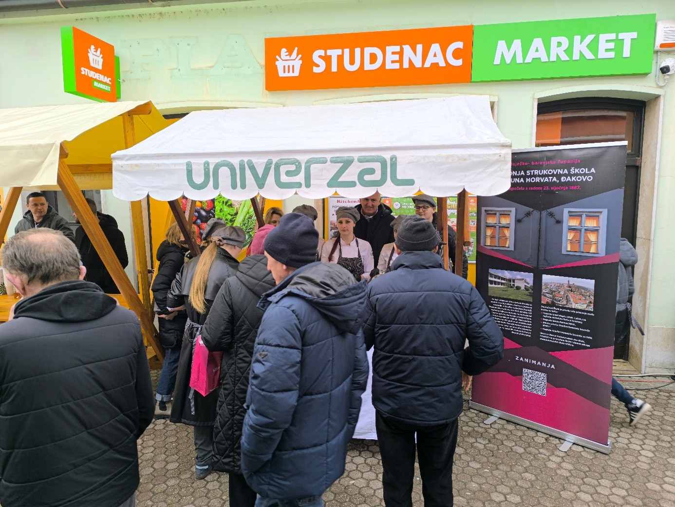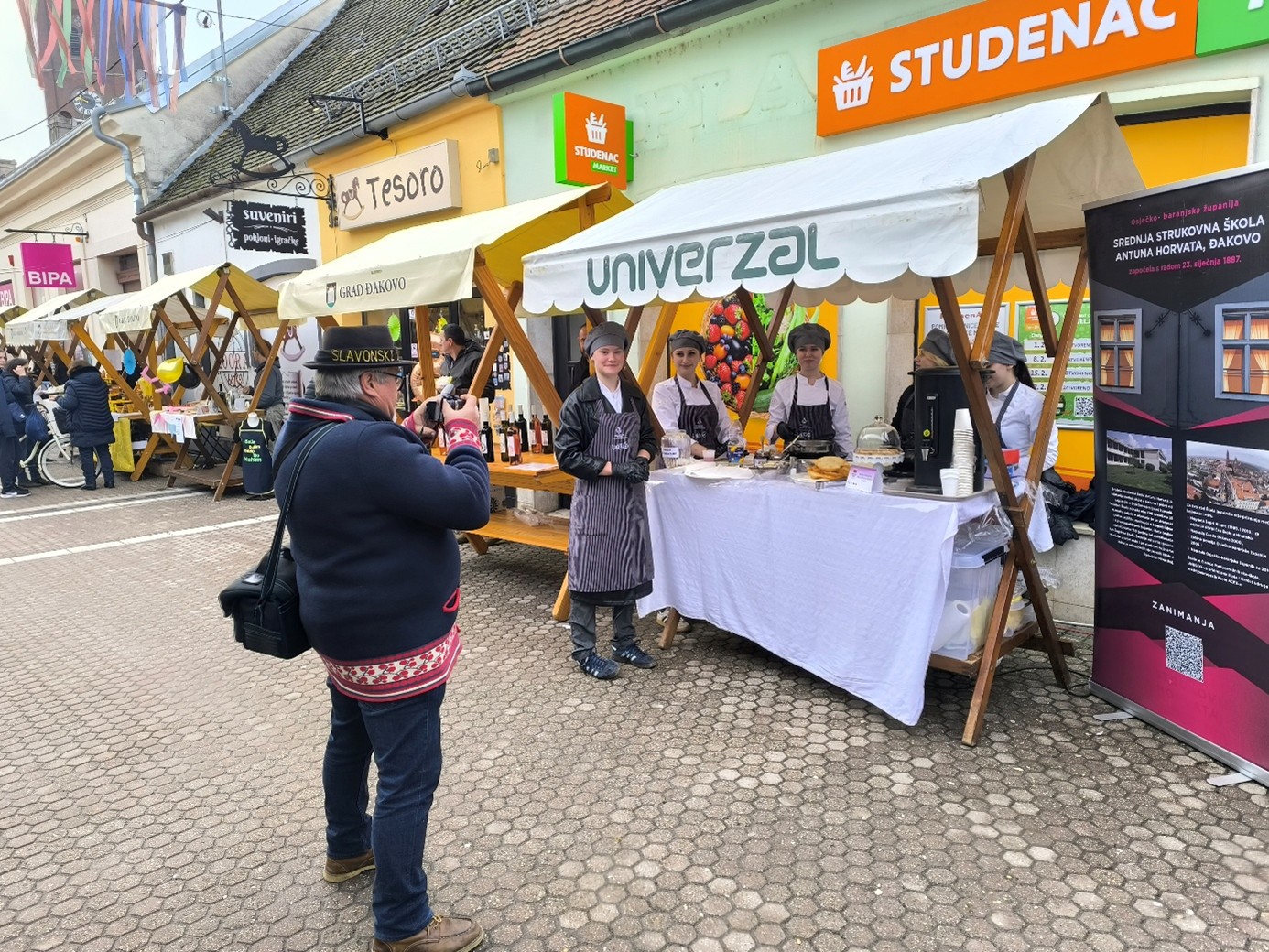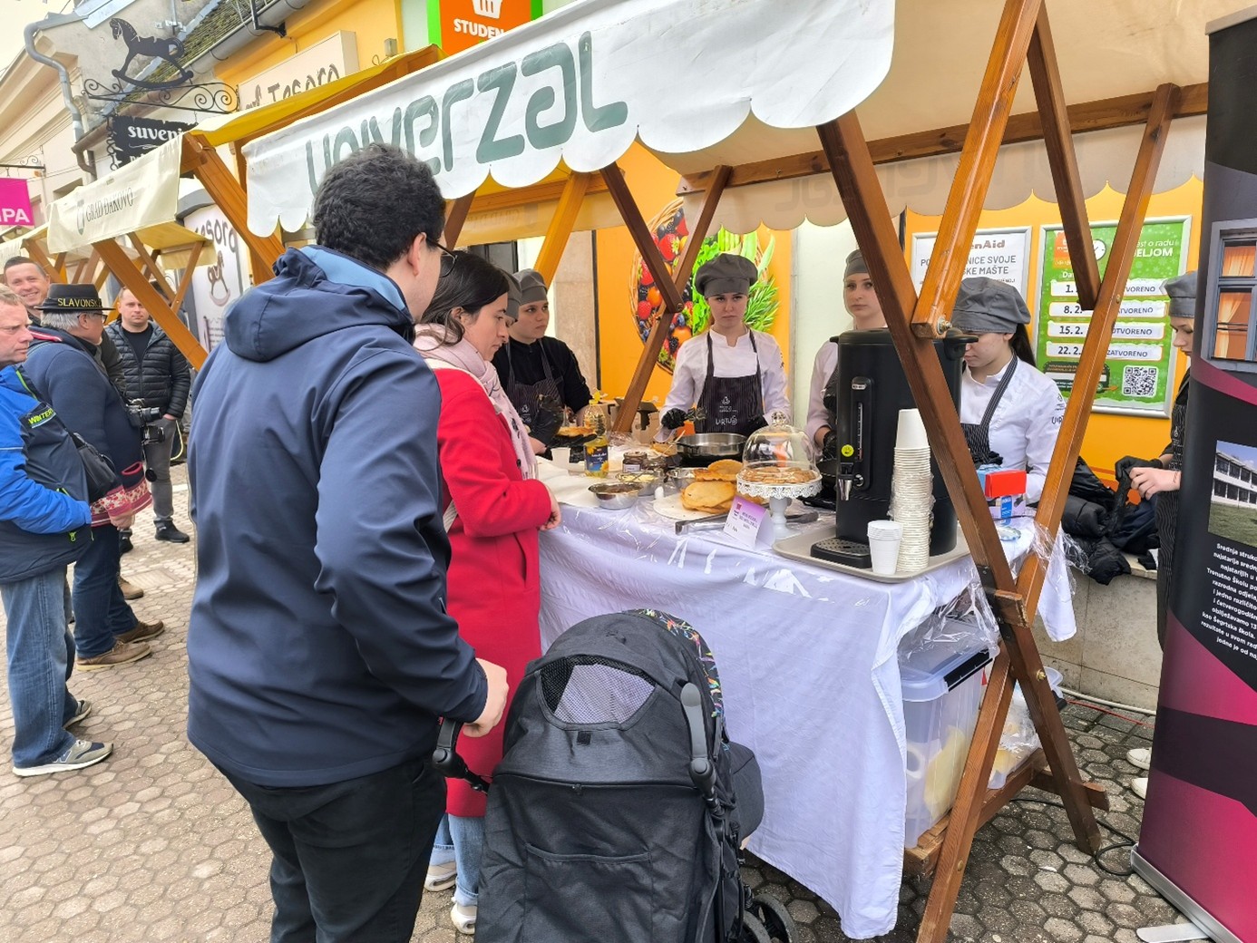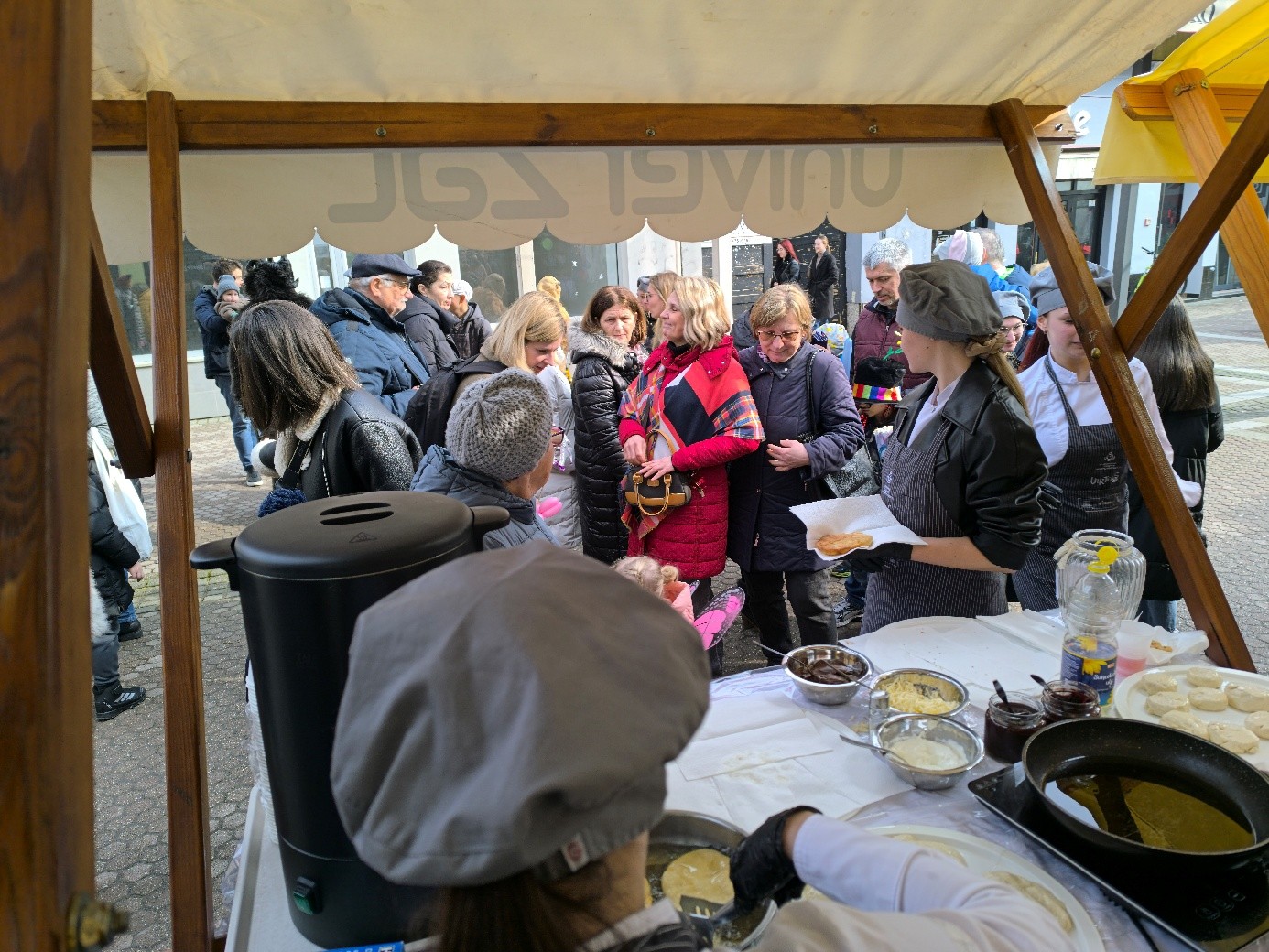 Naša škola sudjelovala je u ovom programu s proizvodom prigodnim za ovakvo događanje – langošicama. Učenici prvog razreda kuhari i pekar -slastičari i učenice drugog razreda slastičarke, zajedno sa svojim nastavnicama Nevenkom Kokalović i Marijom Katilović, predstavili su školu zanimljivom radionicom izrade tradicijskih pokladnih proizvoda.. U dvije smjene tijekom dana pekli su i posjetiteljima nudili langošice s raznim slanim i slatkim nadjevima te topli čaj za okrjepu. Na našem je štandu, kao i uvijek, vladala velika gužva jer su brojni posjetitelji svratili kako bi dali podršku školi i vrijednim učenicima.
