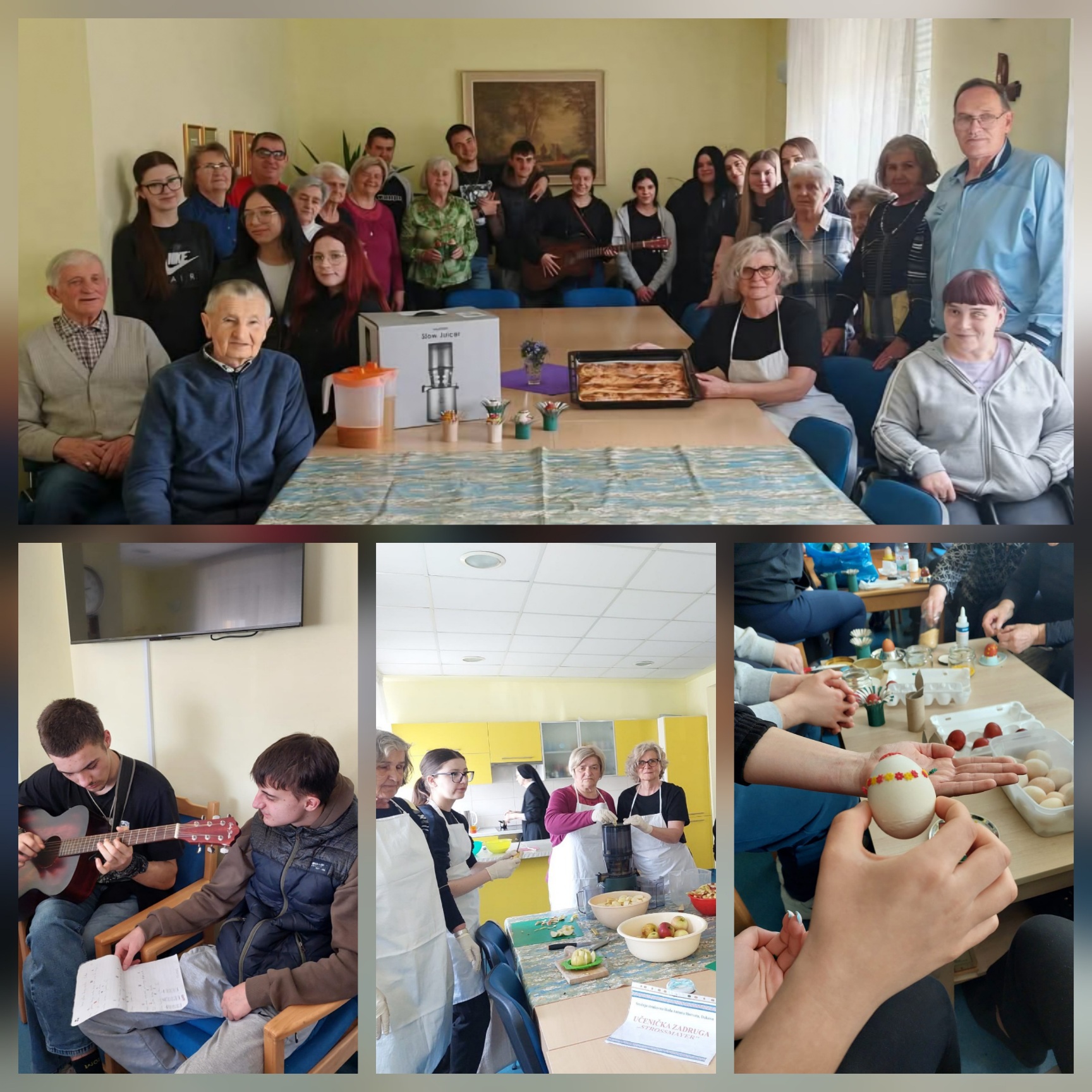Kao članovi slobodne aktivnosti Gastro-kreativa učenici 2. razreda zanimanje kuhar 25. ožujka su s nastavnicama u prostorijama Centra Amadea Đakovo odradili terensku nastavu posjetivši terapijsko spiralni vrt s eteričnim biljkama. Uz prepoznavanje biljaka i nabrajanja poznatih jela s pojedinim mirodijama svi zajedno odradili su radionicu ukrašavanje uskrsnih jaja pomoću zvjezdica od tijesta. Osim uskrsne radionice učenici su s korisnicima pravili sok od jabuka i ispekli savijaču od tropa (ostataka cijeđenja jabuka). Uz zvuke gitare, vrijeme je „proletilo“, kažu korisnici.