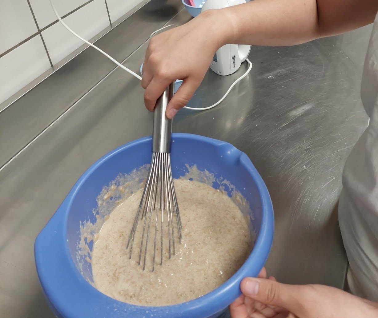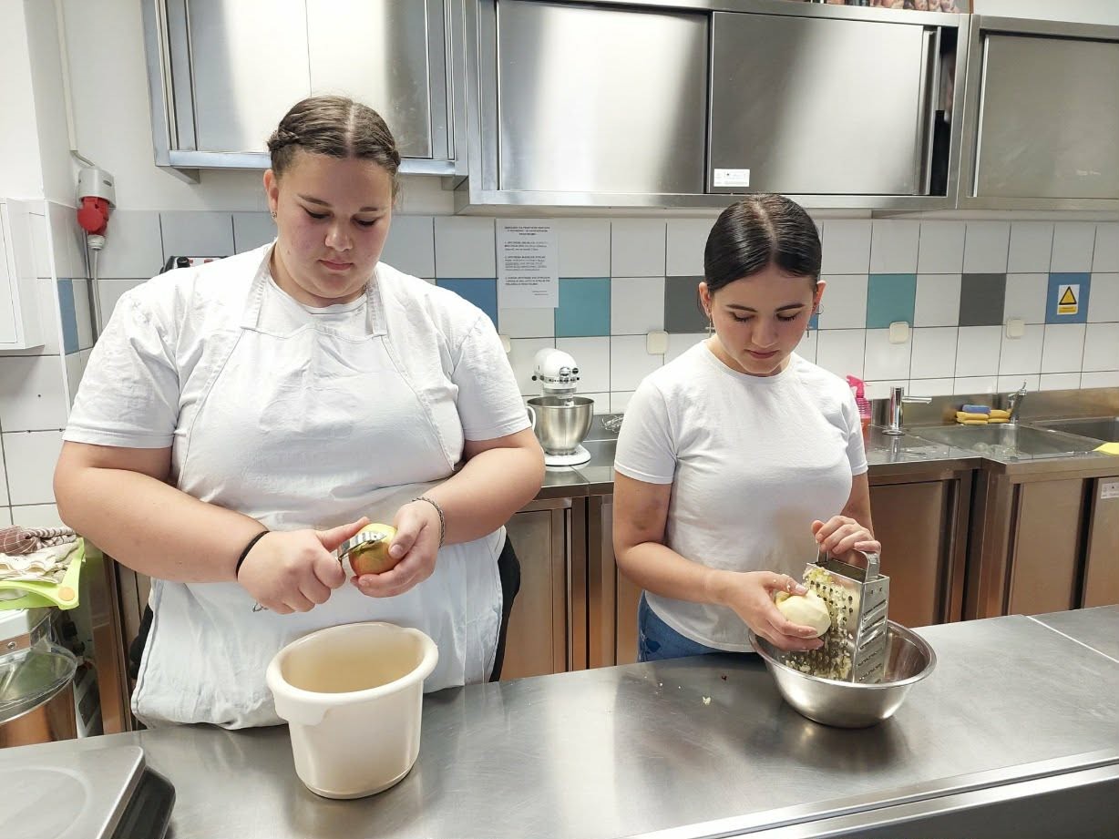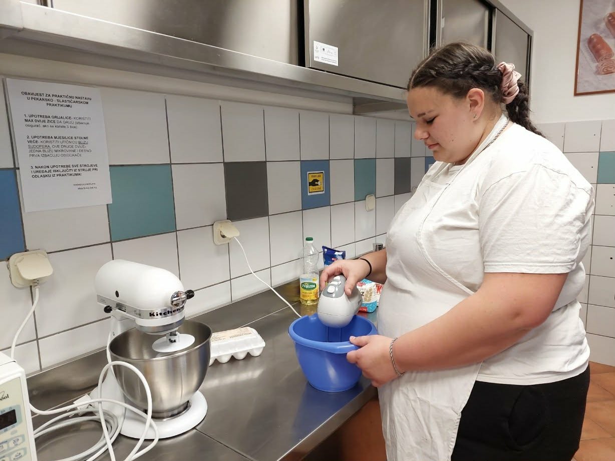 Ana i Samanta, učenice 3. razreda, zanimanje pekar, istražile su recepte na nastavi predmeta Etno pekarski proizvodi, a na satima praktične nastave ispekle kolač s biskvitnim tijestom i jabukama. Postupak izrade kolača zanimljiv je i po tome što se biskvit može mutiti „bakinom žicom“. Pogledajmo recept!