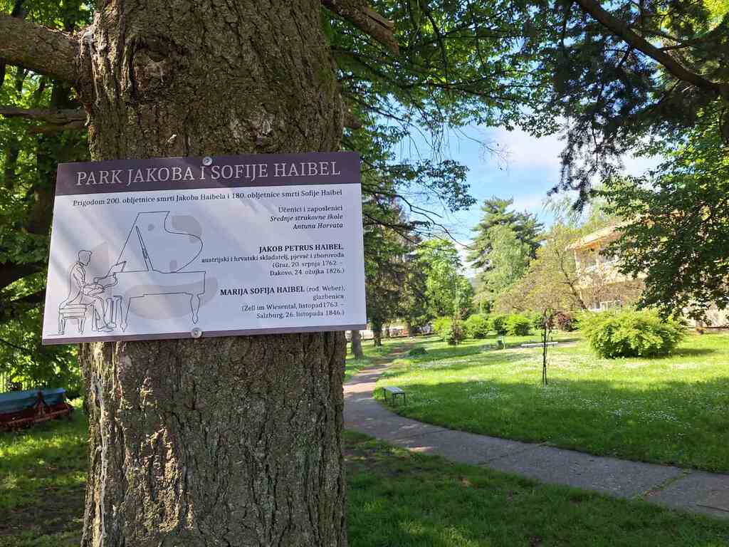 Prigodnim programom posvećenim Jakobu i Sofiji Haibelu, znamenitim Đakovčanima, naš je školski park imenovan  Parkom Jakoba i Sofije Haibel. Ove godine obilježavamo 200 godina smrti Jakoba Haibela (Jakob Petrus Haibel, austrijski i hrvatski skladatelj, pjevač i zboro­vođa (Graz, 20. srpnja 1762. – Đakovo, 24. ožujka 1826.) te 180 godina od smrti Sofijne Haibel (Marija Sofija Haibel (rođ. Weber), glazbenica (Zell im Wiesental, listopad 1763.  – Salzburg 26. listopada 1846.) pa je to bio povod za ovakvu gestu, kojom se ne samo učenicima i djelatnicima škole već i svimn Đakovčanima želi ukazati na ovaj zanimljiv i važan dio lokalne povijesti. Naša škola odradila je niz domaćih i međunarodnih projekata povezanih s Jakobom i Sofijom Haibel, snimila i dokumentarni film te oblikovala praline posvećene Jakobu i Sofiji – Sofijina srca i Haibelove praline.